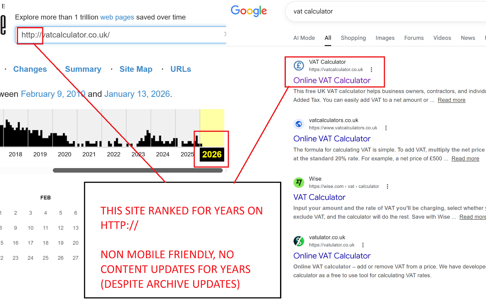 I mean for years, vatcalculator.co.uk which was an EMD ranked number 1 for vat calculator, in fact, it ranked from 2009 and still ranks #1 to this day. It was an unoptimised EMD that was non HTTPS, non mobile friendly, it was the very definition of a site that was just built, deployed and left!