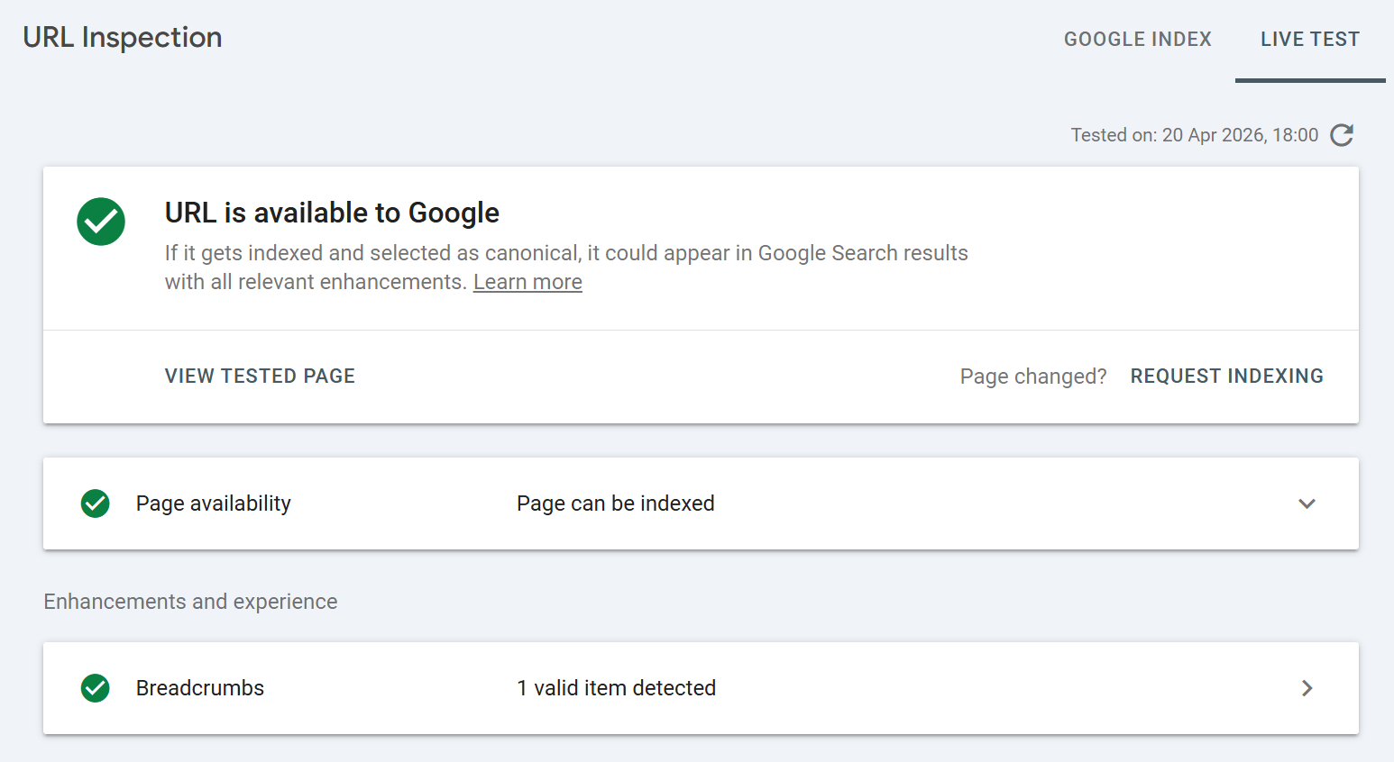 A successful live test does not guarantee indexing. It confirms the URL is eligible for indexing. Google still makes a quality and duplication judgment before committing to index.