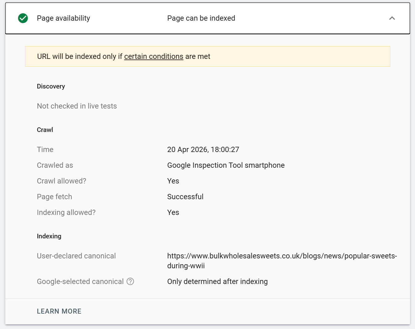 Returns data from Google's index. When you paste a URL and hit enter, you are not triggering a fresh crawl. You are pulling a fresh report based on Google's last crawl of that URL. That crawl could have been minutes ago, days ago, or for low-priority or orphaned URLs months ago. The "Last crawl" timestamp inside the coverage detail tells you exactly when.