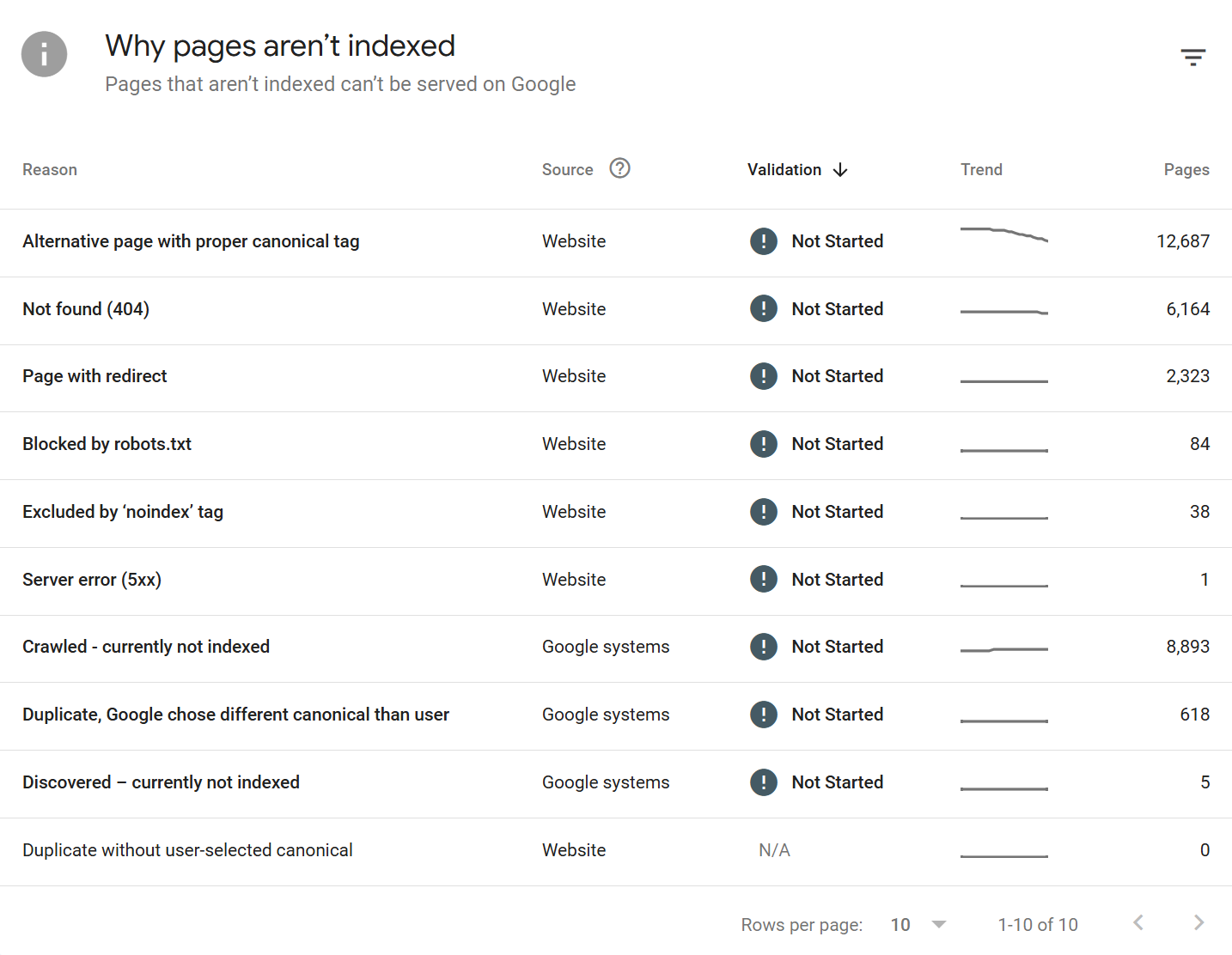 The Page indexing section (previously "Coverage") is where Google shows the specific reasons for a non-indexing decision. These reasons map directly to the states you'll see in the Pages report in GSC. Knowing all of them is essential because the remediation differs for each.