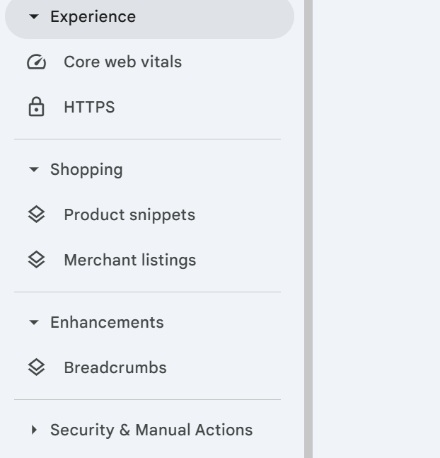 Below the page indexing block, GSC surfaces enhancement-level results. These are tied to specific rich result types, structured data, and experience signals. Common ones:
