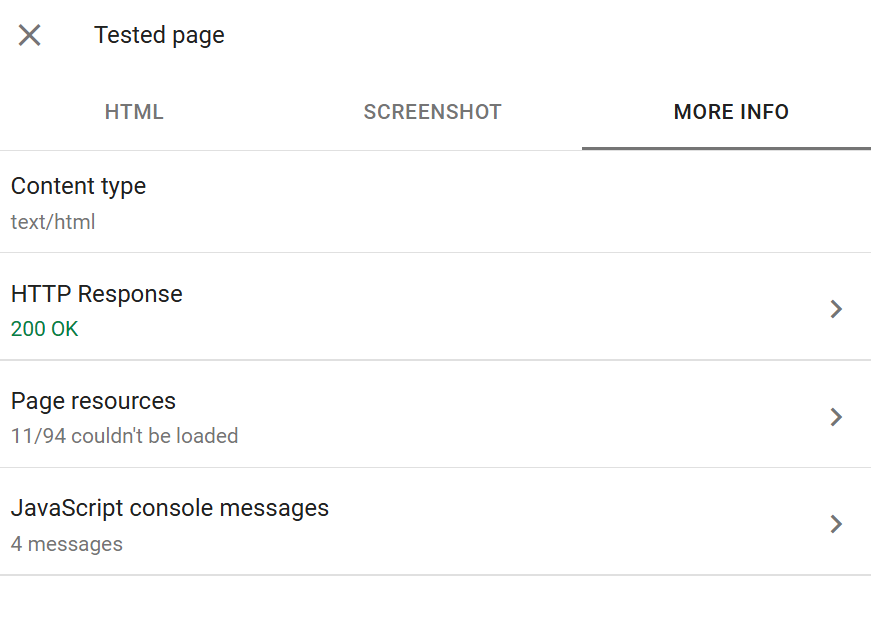 JavaScript Console Messages surfaces every console.error, console.warn, and some console.log calls fired during Googlebot's render. If you've ever debugged a JS app in Chrome DevTools' Console panel, this is the equivalent from Googlebot's browser.
