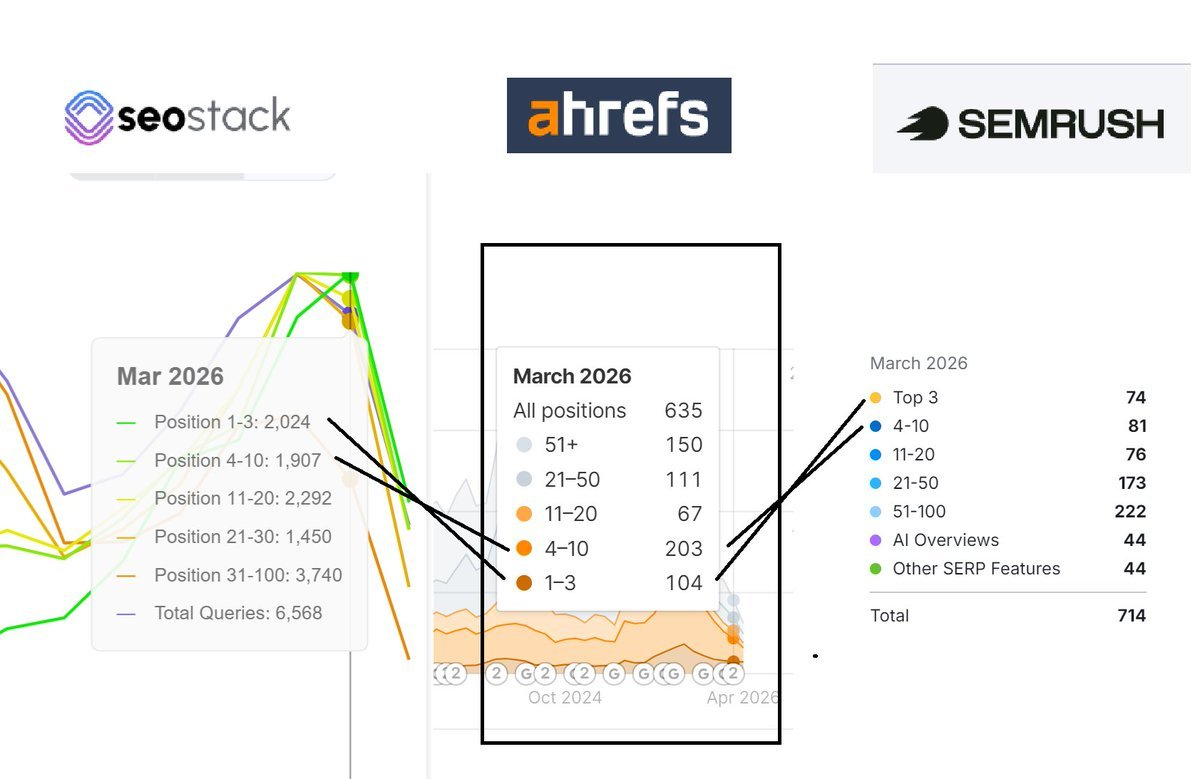 Also - consider the SHEER volume of ZSV queries (zero search volume) - even some of the worlds LARGEST SEO TOOLS such as AHREFS and SEMRUSH only capture a small portion of the data (as shown here comparing SEO Stack, AHREFS and SEMRUSH keyword counts for my own